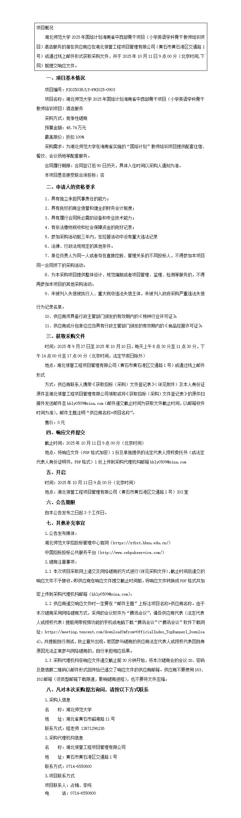 湖北师范大学2025年国培计划海南省中西部骨干项目(小学英语学科骨干教师培训项目)酒店服务竞争性磋商公告