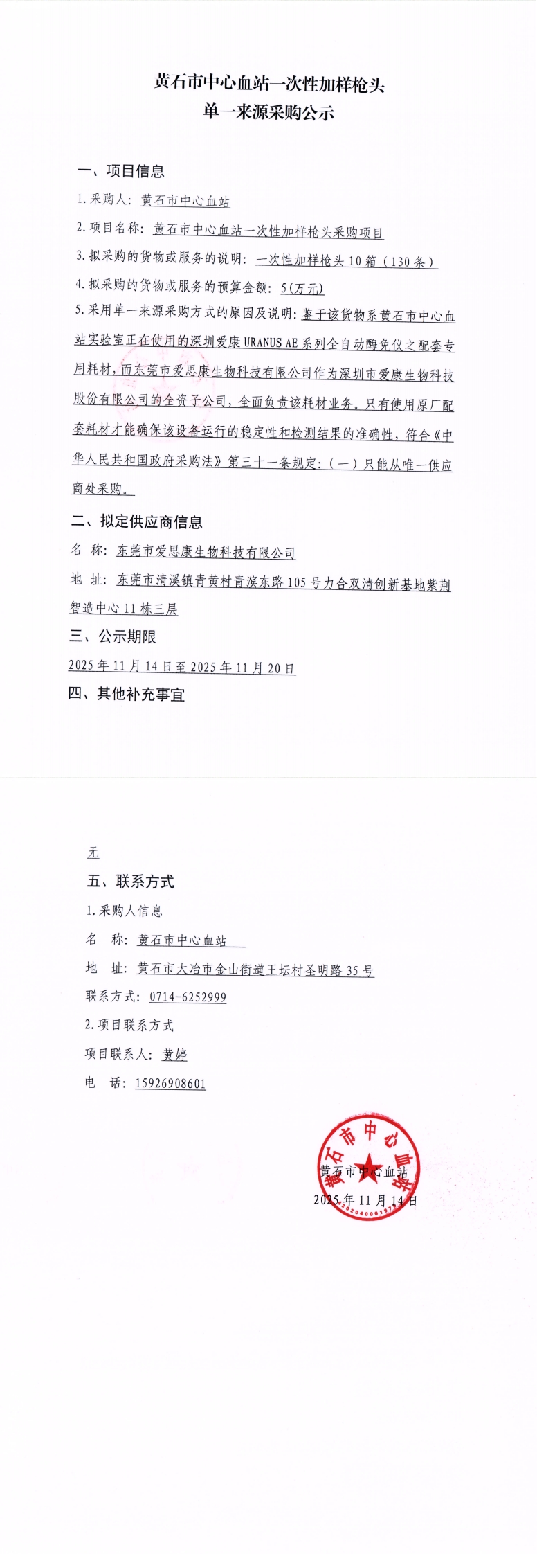 黄石市中心血站一次性加样枪头单一来源采购公示